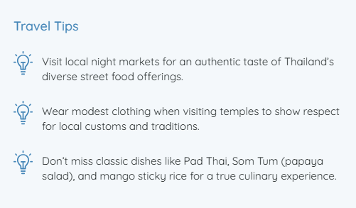 Get ready for a grand Thai escape: where every day bursts with fantastic flavours, captivating sights and awesome adventures! Over the next 13 days, you’ll explore Bangkok’s buzzing streets, soak up the serene vibes of Chiang Mai’s temples and bask in the sun on Phuket’s golden beaches. Think guided tours, cooking classes that turn you into a culinary wizard, plus plenty of free time to dive into local culture. Buckle up for a journey that promises unforgettable moments and plenty of fun!